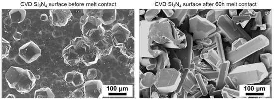 Besides the change in surface morphology, the Si3N4 crystal size is also increased. This may indicate that, on the one hand, a recrystallization process of amorphous coating elements and/or a transition of Si3N4 phase occurred during the silicon melt contact. On the other hand, also a deposition of parasitic precipitates on the CVD coating surface could take place due to the dissolution of Si3N4 coating in liquid silicon, followed by an oversaturation of nitrogen in the melt [17].