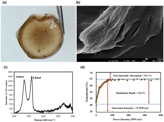 Figure 1b is the Field Emission Scanning Electron Microscope (FESEM) image of the fabricated GO (500 nm in dimension). The figure shows well-defined and interconnected graphene sheets forming a porous and loose sponge-like structure. Figure 1c shows the Raman spectra of the synthesized GO, displaying a D peak at 1359 cm−1 and a G peak at 1600 cm−1. The observation of the D band is due to the defect-induced breathing mode of sp2 rings. On the other hand, the depiction of the G band is caused by first-order scattering of the E2g phonon of sp2 carbon atoms, respectively [,]. As observed, the G band of the GO is located at a higher frequency compared to graphite, which is at 1580 cm−1. This observation corresponds well with the finding reported in []. The (ID/IG) intensity ratio for GO is computed at 0.85, which is the measure of the disorder degree and is inversely proportional to the average size of the sp2 clusters []. Figure 1d displays the measured nonlinear transmission curve of the GO-PEO film. As shown, the film exhibits a 24.1% nonlinear saturable absorption, as well as a modulation depth of 72 MW/cm2 saturable intensity and a 35.1% non-saturable absorption.