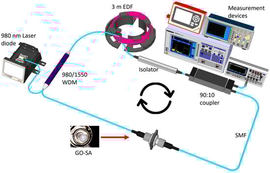 The prepared GO-PEO film was cut into small pieces. A ready-made piece of it was attached to an FC/PC fiber ferrule with index matching gel, as shown in Figure 2 labelled with “GO-SA”. We then matched this ferrule with another fresh ferrule via an adaptor. The insertion loss of the SA was measured as being around 1.5 dB at 1550 nm. The EDFL has a total cavity length of 9 m: 3 m long EDF as the gain medium, 0.6 m wavelength division multiplexer (WDM) fiber, and 5.4 m long SMF, with a group velocity dispersion (GVD) of 21.6 ps2/km, −38.0 ps2/km, and −21.9 ps2/km, respectively, at 1550 nm. To complete a ring cavity laser configuration, a 980 nm laser diode was used to pump the EDF via 980/1550nm (WDM) and directly spliced to unidirectional isolator. A 90:10 coupler was used to extract the 10% of total laser’s intracavity beam for a spectrum and performance evaluation via optical measurement devices. The cavity operates in an anomalous fiber dispersion of −0.20 ps2, and thus traditional soliton tends to be formed in the fiber laser.