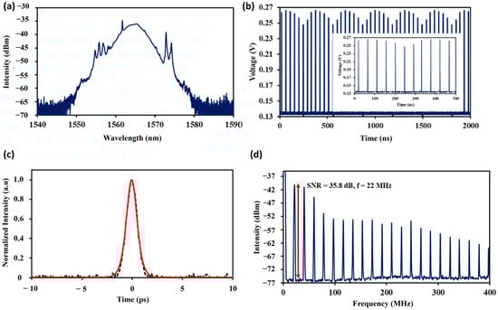 Figure 3c illustrates the pulse width measurement with a secant hyperbolic-fitting curve autocorrelation trace. The pulse duration was measured to be 0.8 ps, and the time-bandwidth product (TBP) was 0.52, which was slightly higher than the value of 0.315 of transform-limited sech2 pulses. This suggests that the optical pulse is slightly chirped. The RF spectrum of the laser is depicted in Figure 3d. The fundamental cavity frequency was 22 MHz (corresponding to the cavity round-trip time, 45.4 ns). The electrical signal-to-noise ratio (SNR) was 35.8 dB, demonstrating that the mode-locking state was stable.