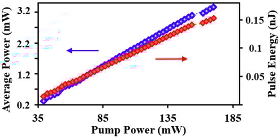 We varied the pump power to validate the laser’s stability and discovered that the mode-locking state could be maintained within pump power ranges of 39.3 to 170.2 mW. We also observed that the mode-locking operation became unstable and disappeared when the pump power was increased beyond 170.2 mW. Figure 4 shows the relationship between the output average power, indicated by blue-dotted lines and single pulse energy with respect to the incident pump power which indicated by red-dotted lines. We found that both the output power and pulse energy increase monotonously with the pump power. At a maximum pump power of 170.2 mW, the average output power and pulse energy were measured to be 3.37 mW and 0.153 nJ, respectively. Pulsing is still present when the pump power is raised to the maximum available power at 170.2 mW. Therefore, it can be concluded that the damage threshold is beyond 170.2 mW. Compared to the previous graphene-based mode-locked laser, our GO-PEO-based laser produced a slightly higher output power and pulse energy [].