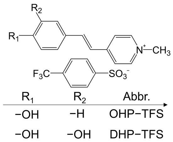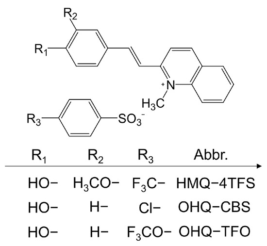 Ionic-type organic NLO crystals are constructed from cations and anions that are different from molecular-type NLO crystals, and it is known that cations are the main source of the nonlinearities [16,17,18]. In this kind of crystal structure, the D-π-A structure is the basic framework of the cation, which is composed of the electron donor (D) part and an electron acceptor (A) part, connected via a π-conjugated bridge. Based on the D-π-A structure, molecules can exhibit large first-order hyperpolarizabilities, which are beneficial for obtaining large macroscopic nonlinear optical susceptibilities, when the molecules crystallize in non-centrosymmetric space groups. Although the contribution of anions to the microscopic first-order hyperpolarization is negligible, different anions can regulate the stacking form of cationic chromophores in the crystal, as well as induce a non-centrosymmetric arrangement [19]. Typical anions include alkyl-substituted benzenesulfonate anions (e.g., T, TMS) and halogenated substituted benzenesulfonate anions (e.g., CBS, BBS). DAST (Supplementary Materials) is one of the most famous crystals and contains a T anion with a great nonlinear optical coefficient (d11 = 210 ± 55 pm/V) at 1.9 µm fundamental frequency light [20]. However, inherent defects, such as an easy deliquescence, strong absorption near 1 THz, and poor mechanical properties, have for a long time limited the further practical application of DAST as a commercial optical device.