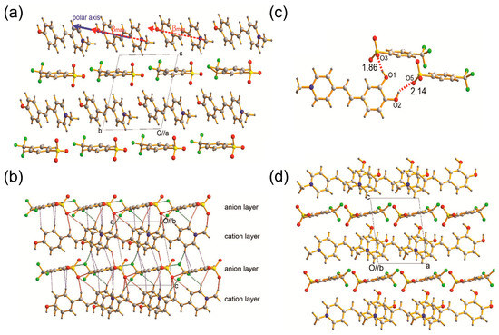 (a) The OHP chromophores are perfectly aligned in parallel along the a-axis, and (b) 3D network-like interionic interactions between cation layers and anion layers in OHP-TFS [28]; (c) catechol induced strong hydrogen bonds between DHP cations and TFS anions, and (d) molecular alignment of DHP-TFS crystals [33].