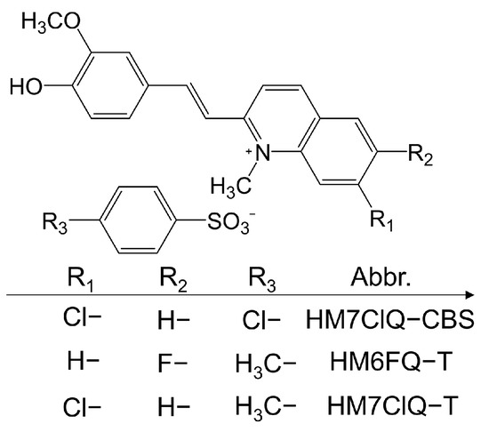 Chemical structures of quinolinium-based HM7ClQ-CBS, HM6FQ-T, and HM7ClQ-T.