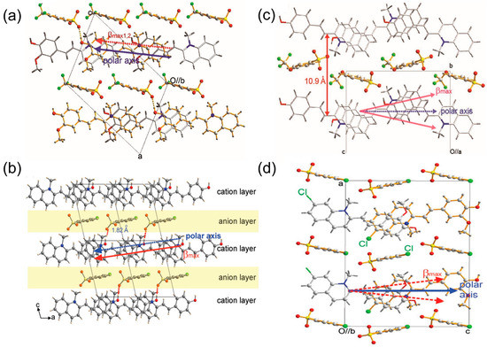 Under the control of the TFS anion, the first hyperpolarizabilities of the HMQ cation in HMQ-4TFS crystals and the polar axis of the crystal are almost in the same direction; namely, the molecular-ordering angle is close to zero, as shown in Figure 6a [29]. The π-π stacking distance of HMQ cations in HMQ-4TFS is 3.62 Å, which is longer than HMQ-T, indicating an attenuation of the strength of π-π interactions. With the help of the 4TFS anion, the SHG intensity of HMQ-4TFS is proven comparable to DAST under the fundamental wavelength of 1250 nm. As shown in Figure 6b, OHQ cations are perfectly arranged in parallel with the help of CBS anions, and the molecular order angle is zero. In OHQ-CBS crystal, the cation layers and anion layers are connected by hydrogen bonds with a distance of 1.82 Å, and the SHG intensity of OHQ-CBS is about 1.2 times that of DAST at 1500 nm [44]. In OHQ-TFO crystal, the ordering angle θp between the polar axis and the direction of the maximal first-order hyperpolarizability βmax is rather small (θp = 12.1°) (Figure 6c) [45]. In OHQ-TFO, the non-planar shaped -OCF3 can produce a large steric hindrance, as well as reduce the π electron density of aryl atoms on anions, preventing edge-to-face π-π cation–anion interactions and leading to an enhanced macroscopic optical nonlinearity (SHG ~2.3 × DAST at 1150 nm). As shown in Figure 6d, HM7ClQ cations are arranged head-to-tail in the same direction with the help of CBS anions. HM7ClQ-CBS crystal with both anions and cations chlorinated exhibits a large SHG intensity, about 1.2 times that of a DAST crystal at wavelength >1400 nm [42].