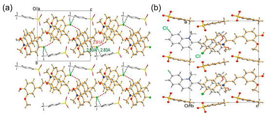 (a) Packing diagram of HM6FQ-T [43] crystal along the crystallographic a-axis and (b) arrangement of HM7ClQ-T along the b-axis [42].