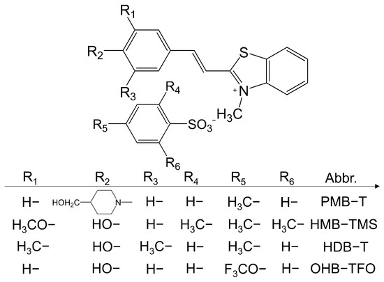 - Kim, P.J.; Jeong, J.H.; Jazbinsek, M.; Kwon, S.J.; Yun, H.; Kim, J.T.; Lee, Y.S.; Baek, I.H.; Rotermund, F.; Günter, P.; et al. Acentric nonlinear optical N-benzyl stilbazolium crystals with high environmental stability and enhanced molecular nonlinearity in solid state. CrystEngComm 2011, 13, 444–451. [Google Scholar] [CrossRef]