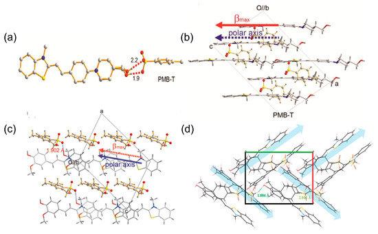 (a) Interaction between the anion and cation of PMB-T; (b) packing of PMB-T along the b-axis [46]; (c) packing of HMB-TMS along the b-axis [47]; and (d) crystal packing diagram of HDB-T crystal [48].