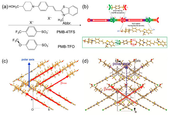 The chemical structures of PMB-based crystals are shown in Figure 11a. In PMB-4TFS crystal, there are double hydrogen bond donors at both ends of the PMB cations and double hydrogen bond receptors at both ends of TFS anions [27]. Anions and cations can be connected head-to-tail, to form a large number of hydrogen bond interactions, i.e., Ar-H (cation)…F (anion)-SO3− (anion)…H-O (cation), as shown in Figure 11b. Regarding the TFO anion, the molecular order angle for PMB-TFO is 56°, leading to a V-shaped arrangement (Figure 11c) [51]. The SHG signal of PMB-TFO is comparable to that of DAST under a wavelength of ≥1400 nm. As shown in Figure 11d, under the regulation of CBS anions, the cations in the PFB-CBS crystal structure are also cross-arranged in the same direction (X-shaped arrangement) and the SHG intensity ratio (η/ηDAST)0.5 is 0.82 [50].