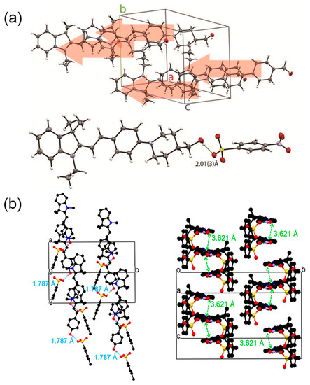 Based on the excellent properties of DAST, a series of derivatives of DAST have also been developed by introducing different counter anions [21,22,23,24,25,26]. To explore this kind of ionic-type organic nonlinear optical crystal for THz generators with improved properties, the following points are usually considered: (i) large macroscopic second-order optical nonlinearity; (ii) good phase matching between light waves and terahertz waves; (iii) reducing self-absorption in the THz region; and (iv) stable physical and chemical properties [27,28]. In recent years, researchers have found that the combination of strong electron donors and acceptors, which can produce strong hydrogen bonds between electronegative groups and the molecular skeleton, is very beneficial for suppressing the THz absorption modes of organic electro-optic salt crystals [27,29]. Through this strategy, the contribution of π-π stacking interactions and hydrogen bonds to the secondary bond interactions can be controlled, not only achieving the purpose of restraining the molecular vibration mode in the crystalline state, but also obtaining a favorable spatial arrangement [29].