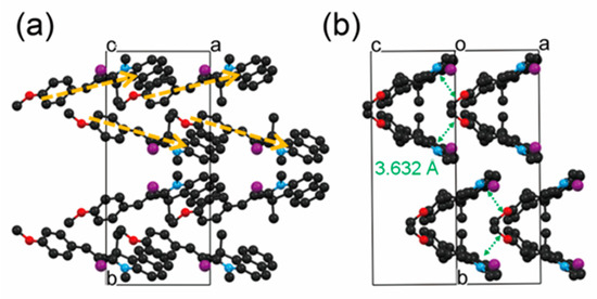 (a) Crystal stacking of EHPSI-4NBS [52], and (b) molecular stacking along the [101] direction in OHI-T [53].