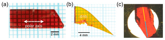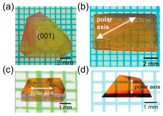 - Matsukawa, T.; Yoshimura, M.; Takahashi, Y.; Takemoto, Y.; Takeya, K.; Kawayama, I.; Okada, S.; Tonouchi, M.; Kitaoka, Y.; Mori, Y.; et al. Bulk Crystal Growth of Stilbazolium Derivatives for Terahertz Waves Generation. Jpn. J. Appl. Phys. 2010, 49, 075502. [Google Scholar] [CrossRef]