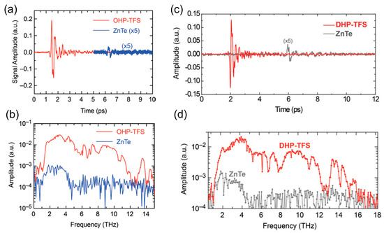 (a) Time and (b) frequency-domain amplitudes of the THz waves generated in a 0.31 mm thick OHP-TFS [28]; (c) time and (d) frequency-domain amplitudes of the THz waves generated in a 0.15 mm-thick DHP-TFS at a 1560 nm wavelength [33].