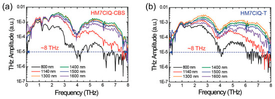THz amplitude spectra generated in (a) 0.16 mm thick HM7ClQ-CBS and (b) 0.07 mm thick HM7ClQ-T crystals at different pump wavelengths [42].