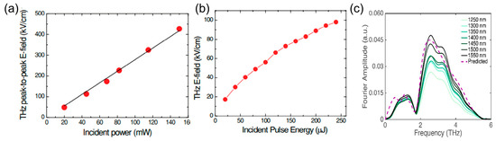 Peak THz E-field generated as a function of incident pulse energy by (a) 0.33 mm thick PMB-T [46], (b) 0.26 mm thick HMB-TMS [47], and (c) THz generation spectrum of P-BI [54].