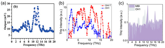 Tuning the THz generation of (a) HDB-T [48]; (b) OHI-T [53]; and (c) 0.8 mm-thick MBI and 0.16 mm-thick OH1 [55].