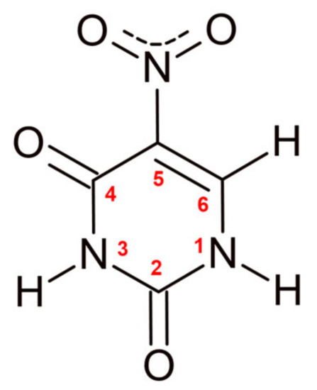 - Craven, B.M. The Crystal Structure of 5-Nitrouracil Monohydrate. Acta Crystallogr. 1967, 23, 376–383. [Google Scholar] [CrossRef]