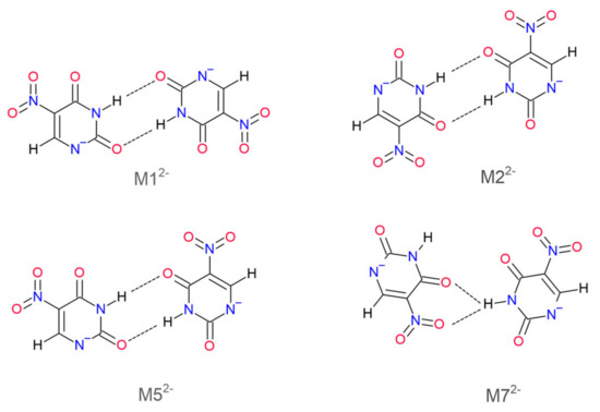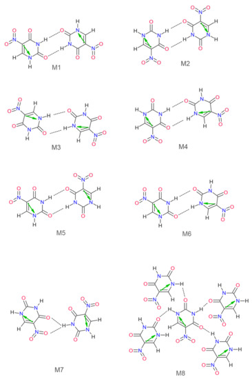 In this section, we review the structures containing the molecule of 5-nitrouracil or of its mononegative ion, along with the observed optical properties. We also present two new salts of 5NU. The following figures, Figure 2 and Figure 3, portray the most common H-bonded clusters between neutral 5-nitrouracil and negative 5-nitrouracil molecules. The approximate direction of the molecular dipolar moment is shown as a green arrow.
