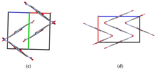 There are three known polymorphs of 5-nitrouracil: two centric and one acentric. Table 1 contains the main crystallographic information about the three crystal forms. In the two centric forms (P21/n and Pbca), the molecules aggregate via H-bonds in chains. Within the chains we can see the M2 and M3 motif, with the dipolar moments anti aligning within the chain (Figure 4). Using Margaret Etter’s [40,41,42] set of rules to describe hydrogen bonds, a first level graph sets rings with graph set symbol R22(8) for both M2 and M3 motif (in Etter’s methodology the repeating hydrogen-bonding motifs are designated by descriptors with the general symbolization where G indicates the motif, such as rings (R), chains (C), intramolecular (S) and discrete (D); a and d represent the number of acceptors and donors and (n) the number of atoms contained within the motif).