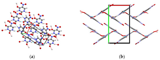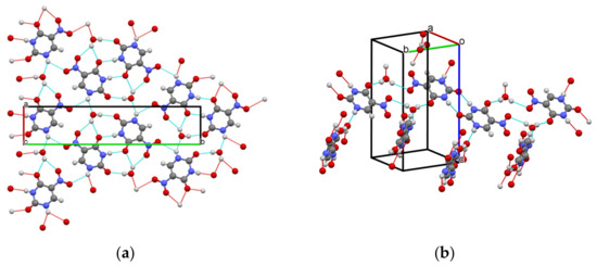 In (IV), molecules of 5-nitrouracil are hydrogen bonded (N-H…O) in pairs across crystallographic centers of symmetry with the M2 motif (see Figure 2 and Figure 6a). The resulting dimers are further hydrogen bonded through water molecules in layers parallel to the (102̅) plane (conventional unit cell), at an interplanar separation of 2.979 Å [47] In (V) the formation of pairs across crystallographic centers of symmetry is also seen, this time displaying the M1 motif (R22(8)). The dimers are interconnected through H-bonds involving the water molecules, forming a three-dimensional network (Figure 6b, [49]). In this form, the nitro group is rotated by 12.4(1)° out of the uracil plane, while in (IV) this rotation is less than 5°.