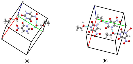 The crystallization of 5NU in aqueous ethanol resulted in a centrosymmetric crystal structure that incorporates both water and ethanol solvate molecules. The crystal structure display two types of molecular assembling via H-bons: a cluster (0D) containing a dimer of 5NU two water molecules and two ethanol molecules, with a M2 motif (R22(8) in graph set analysis), an element that is also seen in compound (IV) and 5NU/ethanol chains (1D) in which the nitrouracil molecules are not related by an inversion center (Figure 7a,b). The inversion center relates to two distinct chains, therefore annihilating the large dipole that each chain contains.