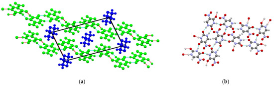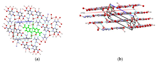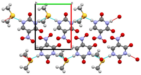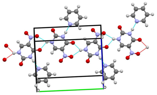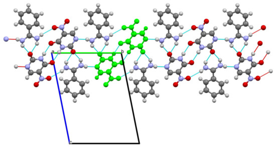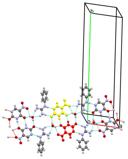 The crystals of diphenylguanidinium 5-nitrouracilate [56] incorporate two water molecules per asymmetric unit cell, aggregating anions and cations into H-bonded slabs that stack along the c axis (Table 10, Figure 24). 5NU ions are strongly H-bonded into dimers, showing the M12− (R22(8)) motif.