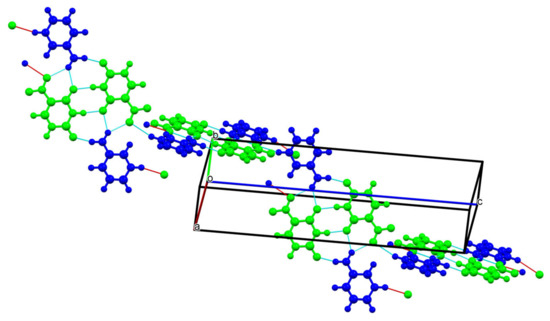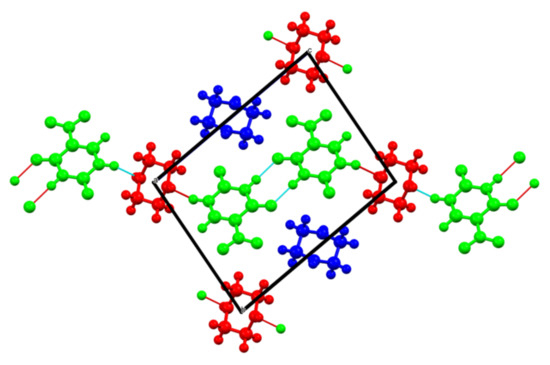 The benzamidinium and 5-nitrouracilate ions aggregate in ribbons profusely H-bonded (Figure 27). One can spot the dimer formation with the M22− motif (R22(8)) [59]. Ions within the dimers are related by an inversion center.