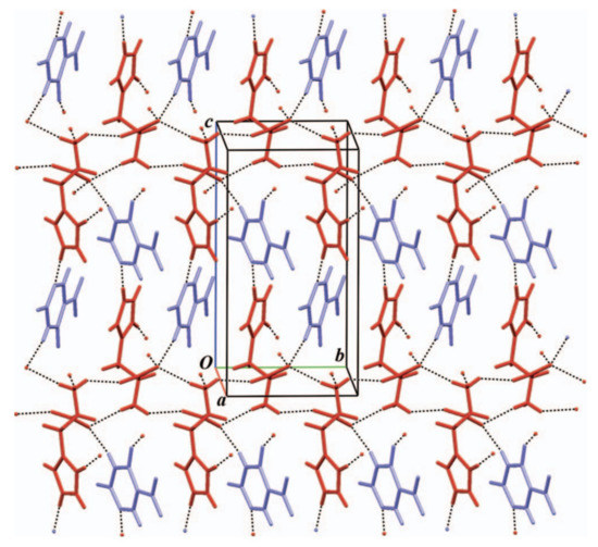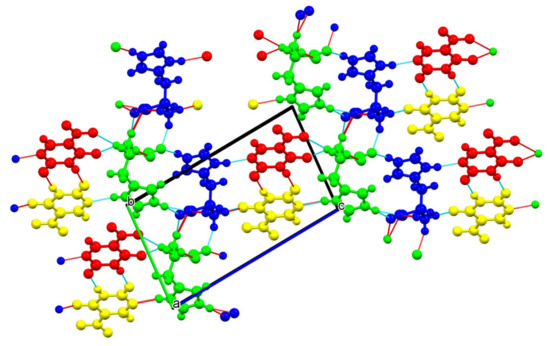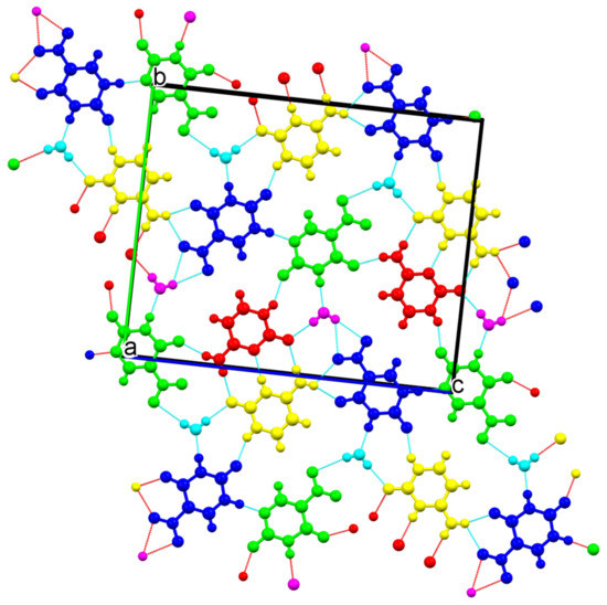 The crystals that grow from a 1:1 aqueous solution of cytosine and 5-nitrouracil [52] after heating, stirring and refluxing, belong to a subclass that intersects the family of cocrystals, salts and solvates [58]. The asymmetric unit of (XXII) contains one neutral molecule of cytosine, one charged ion of cytosine, one neutral molecule of 5-nitrouracil, one charged ion of 5-nitrouracil and two water molecules, see Table 11 for more parameters. In Figure 26, one can see how these molecules/assemble in the solid: they are all hydrogen bonded in layers parallel to the bc plane. The neutral/charged ion of the same species are strongly bonded together by sharing a hydrogen atom between the protonated/deprotonated sites (yellow/red for cytosine and blue/green for nitrouracil for protonated/deprotonated forms in Figure 26).