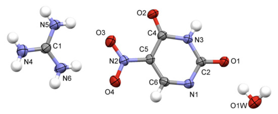 Guanidinium 5-nitrouracilate monohydrate: Guanidine carbonate (Aldrich 99%, 0.5 mmol) and 5-nitrouracil (Aldrich, 98%, 1 mmol) were dissolved in 100 mL of boiling water. The solution was left to evaporate under ambient temperature and pressure. Colorless prismatic single crystals grew from the solution by slow evaporation over a period of a few weeks.