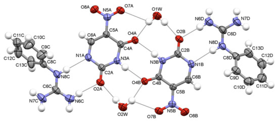 A plot with the symmetry-independent molecular units of phenylguanidinium 5-nitrouracilate monohydrate. Displacement ellipsoids are drawn at the 50% probability level. Hydrogen bonds are shown as dashed lines.