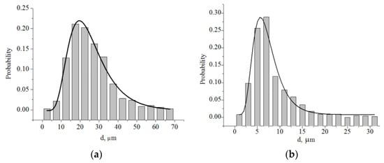 Figure 2 shows grain size distribution histograms in coatings deposited with the commercial electrode (for ferrite grains) and electrodes containing 0.25 wt% titanium carbonitride nanoparticles (for pearlite grains). The analysis of the obtained results indicates that all histograms can be described by lognormal distribution functions (shown by solid lines in Figure 2a,b), whose parameters (median size and variance) depend on the content of nanoparticles in the coating. The average size of ferrite and pearlite grains in coatings with different estimated content of titanium carbonitride nanoparticles was calculated using the known relation <X> = Xcexp(w2/2), where <X> is the average size, Xc is the median size, and w is the lognormal distribution variance.