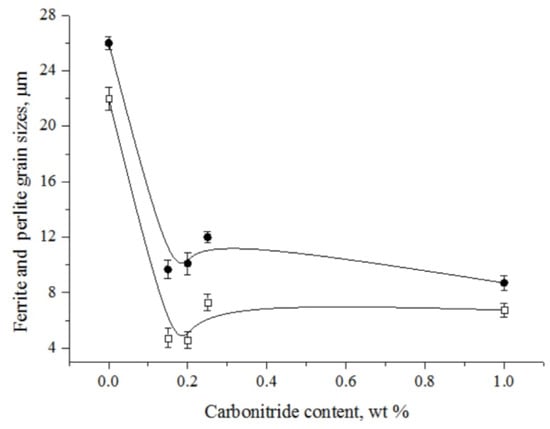 Ferrite (●) and pearlite (□) grain size as a function of the content of titanium carbonitride nanoparticles in coatings.