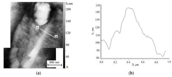 Figure 4a presents two stitched STM images of the structure observed in the coating with 0.2 wt% TiCN, and Figure 4b shows a cross-sectional profile along line AB shown in Figure 4a. One can see an acicular structure (subunit [,]) in the central part of the figure and a coarse particle with the cross-sectional dimension more than 1 μm at the grain boundary in the upper part of the figure.