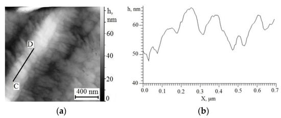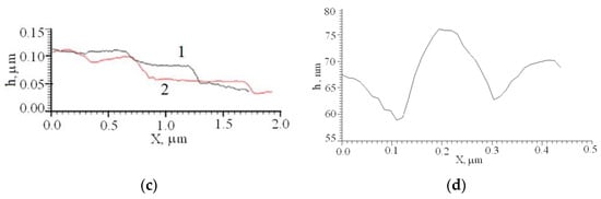 Figure 6c (curves 1 and 2) presents cross-sectional profiles of plates along lines a-a’ and b-b’ shown in Figure 6b. It can be seen (Figure 6c) that the cross sections of plates D, C, and B (curve 1) and D and C (curve 2) have terraces about 500 nm long, which end in steps, being about 30–50 nm above the terrace of the next plate.