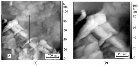 Methods of scanning probe microscopy (SPM), namely, atomic force (AFM) and scanning tunneling microscopy (STM), have high horizontal and vertical resolution and are successfully used to study the mechanisms of austenite decomposition and fine morphological features of the resulting structures, such as grain-boundary ferrite [], Widmanstatten ferrite [], bainite [,,,,,], and martensite []. The relief was studied both on pre-polished samples to reveal austenite decomposition phases [,,] and on samples that were chemically etched to see a structure [,,,].