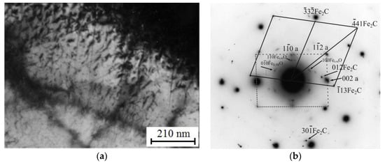Figure 8a shows a typical bright-field image of the α-ferrite structure, for which the selected area diffraction pattern is obtained (Figure 8b) with the direction of the incident beam parallel to the most important axes of the matrix zones. Figure 8a shows equally oriented plates or laths several nm wide and several tens to a hundred nm long. The electron diffraction pattern obtained from this section of the structure contains α-phase diffraction reflections belonging to the [110], [134], [320] zone axes, of which only the lattice with the [110] zone axis is shown in Figure 8b. In addition, Figure 8b shows sixth-order symmetry diffraction spots regularly ordered with respect to the diffraction spots of the matrix, which indicates that the crystal phases are coherent with the matrix.