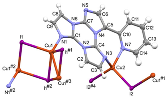 To the best of our knowledge, this structural motif is rare among copper(I) halide-based compounds, and it has been structurally characterized only in the structure of [{Cu(μ3-I)}2(4,2′-pypzpy)2{Cu(μ-I)}2]n (4,2′-pypzpy = 4-(1-(pyridin-2-yl)-1H-pyrazolyl)pyridine) (CSD refcode GAJBEB [50]), where the ligand is bridging/chelating as TT-Py.