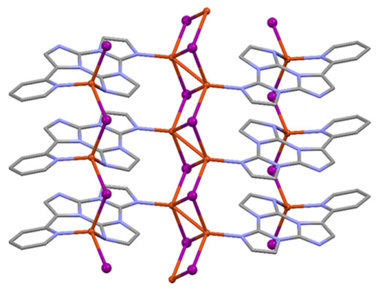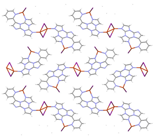 Cu-I and Cu-N bond distances are similar to those of other known stairs analogous to that present in 1 [47,48] and, in particular, to that of the strictly related species [Cu2I2(TT)]n, where the nitrogen ligand is the non-substituted cyclic triimidazole molecule [26,27]. Along the stair of 1, the Cu1∙∙∙Cu1 nearest neighbor distances show two different values, namely 3.4134(12) Å and 2.7625(11) Å, which are, respectively, alternately longer and shorter than the sum of van der Waals radii of Cu(I) ions (2.80 Å) [49]. The dihedral angle between adjacent Cu2I2 planar units along the stairs is 113.92° (Figure 2). The ligands are disposed on both sides of the stairs with the TT fragments and the pyridine groups all parallel to each other. The distances between triazinic centroids and between pyridine centroids of adjacent ligands are the same and correspond to 4.271 Å (the unit cell parameter a). The presence of the 2-pyridine attached to the TT fragment allows the coordination of a second copper atom (Cu2) by N3 (imidazole) and N7 (pyridine) nitrogen atoms belonging to the same ligand, generating a seven-membered chelate ring (Figure 1). To allow the ligand to chelate, the pyridine fragment must rotate around the TT-Py bond, resulting in a less planar conformation with respect to that found for the free ligand (dihedral angle N7–C10–C5–N4 of 28.60°, to be compared to values in the range 144.4–156.1° found in the different polymorphs of the free ligand [30]). However, the conformation of the chelate ring is very similar to that found in the previously reported compound [Cu(μ-NO3)(NO3)(TT-Py)]n [28], in which the ligand chelates in a similar manner (dihedral angle of 28.4°). Cu2 has a [CuI2N2] distorted tetrahedral coordination environment, being coordinated by two bridging iodide ions (I2), in addition to the two nitrogen atoms, giving rise to a zig-zag chain of composition [CuI]n. Bridging iodide has an angular geometry and, along the chain, the I···I distance (which is equal to the Cu···Cu distance) is of 4.271 Å (the unit cell parameter a). A center of inversion located on the ladder generated a second zig-zag chain with opposite orientation with respect to the central ladder motif. The overall structural motif remains, then, monodimensional, being made by three parallel copper iodide chains connected by bridging ligands.