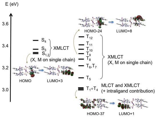 To interpret this different photophysical behavior, DFT and TDDFT calculations were performed on a discrete model of the [Cu2I2(TT-Py)]n infinite coordination polymer, using the same computational protocol adopted for the discrete model of [CuI(TT)]n [27,29] (see Figures S6 and S7, respectively, for HOMOs and LUMOs plots involved in the low energy transitions; and Tables S4 and S5, respectively, for the singlet and triplet excitation energies and main orbital contributions [51]). It is found that, while for both compounds the LUMOs are distributed only on the ligand, the HOMOs display different delocalization schemes. For the [Cu2I2(TT-Py)]n model, all the HOMOs are localized on either the CuI inorganic core (related to either the double strand or the single chain) or the CuI-ligand unit (CuI belonging to the double strand). In particular, the former are the high-lying HOMOs and are mainly involved in the high energy triplets, while the latter are inner HOMOs and principally contribute to the low energy triplets (T1–T4, see Figure 5). On the other hand, for the [CuI(TT)]n model compound, some HOMOs are localized on either the Cu-I inorganic part or the Cu-ligand unit; while, the others are distributed exclusively on the ligand. Therefore, while for [CuI(TT)]n, both MLCT (or XMLCT) and LC transitions are expected, the former associated with the broad phosphorescence band and the latter to the two weaker long-lived components; for [Cu2I2(TT-Py)]n, all the low-energy transitions are of MLCT or XMLCT character, reflecting in only one long-lived emission. Such different emissive behavior can be explained by the different coordination scheme in the two CPs: in [CuI(TT)]n, the organic ligand coordinates one metal ion only, giving rise to a single Cu-N bond, while in [Cu2I2(TT-Py)]n, it coordinates two metal ions, forming three Cu-N bonds; therefore, enhancing the charge delocalization on the whole metal–ligand system.