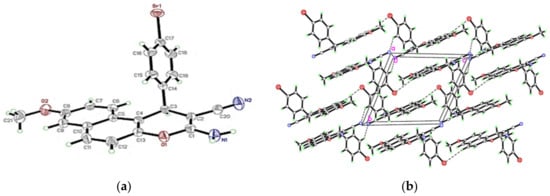 Compound 4 was crystallized in the triclinic system and the P1 (2) space group with unit cell parameters of a = 8.9866(3)Å, b = 10.8369(4)Å, and c = 11.2286(4)Å, α = 103.576 (2)°, β108.816(2)°, γ110.455(2)°. The unit cell volume was 892.292 (6) Å3 (Supplementary Materials Table S1). Molecule 4 comprised three fused rings, which were in perfect planarity mode, as illustrated in Figure 1. The benzo[f]chromene ring occurred in the envelope style and linked in a perpendicular mode with 4-bromophenyl.