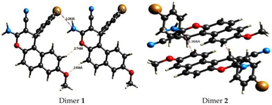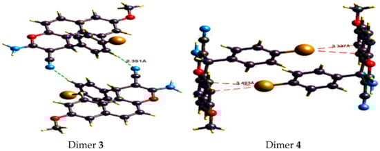 Crystal Explorer [30] was applied to extract the molecular dimer for compound 4 by calculating the intermolecular interaction energies. The result showed that there were four structural motifs (Dimers 1–4). The interaction geometries with the corresponding energies are shown for dimers 1–4 (Table 2). The dimer structure for compound 4 showed that the intermolecular interaction energy ranged from −73.7 to −9.9 kJ/mol−1 (Table 2). The intermolecular forces stabilized these 1–4 dimers including C–H···N, C–H•••O, CH•••Br, π•••π, respectively (Figure 2). Etot (kJ/mol−1) for the four dimers included dimer 1 = −4–73.7, dimer 2 = −61, dimer 3 = −39.4, and dimer 4 = −28.9 (Figure 2).