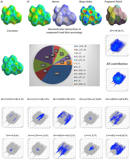 The intermolecular bonds and Hirschfeld “HF” surfaces that contribute to the molecular packing of compound 4 (Figure 3). “dnorm” was calculated as reported in [31]. The “rvdWi” and “rvdWe” were connected to Van der Waals-radii for the nearest interior with exterior particles via the morphology. The +ve value of dnorm related to short rvdW, but the lengthy rvdW had a −ve value. Crystal-Explorer [30] was used to find (de and di) the correlation for the HF, and the 3D HF is shown in Figure 3, over; dnorm in (−0.4643–1.5692) Å, di (0.8260 to 2.7645) Å, de (0.8253 to 2.6546), shape index (−1.00 to 1.00) Å, curvedness (−4.00 to 4.00) Å, and fragment-patch (0.00–13.00) Å, respectively. The shortest interactions that contributed in packing molecule 4 included “Br•••O/Br•••O,O•••C/O•••C&N•••C/N•••C”. The “O•••H” interactions were characterized by the red zone in the dnorm-fingerprint; these connections are smaller than the vdWs radii, as represented in Figure 3.