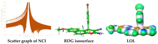 The LOL “localized orbit locator” was applied to analyze the relation between the electrical and geometric structure to enhance the understanding of the bond mechanics of the molecule. The topological features of the molecule 4 monomer in the aqueous phase were studied using LOL analyses. In Figure 4, the green color denotes a location with large LOL values (localization area), while blue and gray represent a region with poor LOL values (delocalization area) for the monomer [33]. These graphs show blue and gray areas localized around the H atoms of the rings due to the electron depletion. The green and blue zones (rich electron sites) were capped over the carbon atoms, corresponding to the H-bond donor in monomers to produce the dimer.