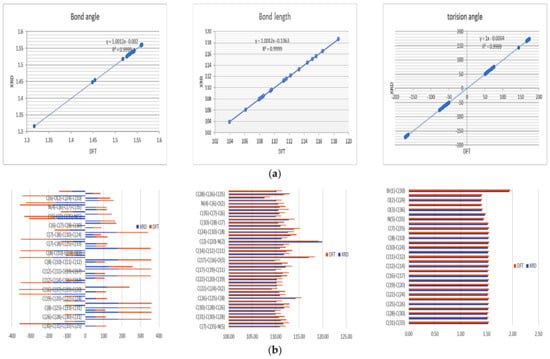 (a) The experimental XRD and DFT parameters. (b) Straight−line correlation for the geometric optimization parameters between the experimental and theoretical data.