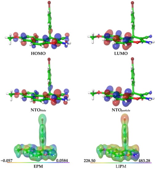 LIPM is preferable to EPM [36] as its map designated site has electrons that are tightly bound and hence more slightly detached, and can be calculated by the Sjoberg equation [36]. The blue tint of the LIPM denotes the low electron density distribution around the molecular skeleton. Thus, the NH2, OCH3, and CN groups of molecule 4 are desirable sites for electrophilic attacks.