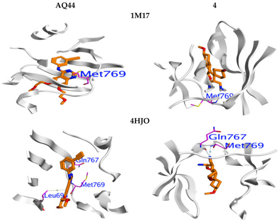 In silico study was conducted to scrutinize the biological finding by using docking experiments against the wild-type EGFR-TKD (PDB ID: 1M17 [38] and PDB ID:4HJO [39]) and used the co-crystal erlotinib (AQ44) as the reference inhibitor, as shown in Figure 7. The designed molecule 4 exhibited superior docking scores and orientations compared to erlotinib (Table 5). The binding site for both proteins was the same, which included ”GLN767, MET769, THR830, and ASP831” for both proteins [38,39]. The docking experiment was accomplished by Glide’s module®. To validate the docking protocol, the original inhibitor [erlotinib “AQ44”] was redocked into the crystal structures of EGFR. The binding free energy ΔG is listed in Table 5. The original inhibitor was suitably fitted into their own binding sites for their crystal structures. The most potent pose selected was based on the lowest ΔG and rmsd.