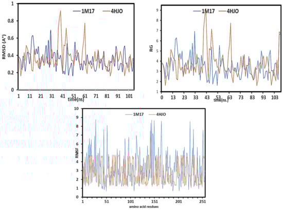 As a result, the studied complexes had a RMSD less than 2.5 during the simulation, defining the complexes’ stable comparative nature. The analyzed “RG, radius-gyration” along the studied trajectories showed the flexibility and mobility degree for the 1M17 and 4HJO complexes. The RG steady degree for the studied complexes appeared at 33 ns and 43 ns for 1M17 and 4HJO, respectively. The “RMSF, root-means-square-fluctuations” were also explored to investigate the flexibility of the residues of amino acids (Figure 9). The low RMSF <2.5 Å for 1M17 and 4HJO showed a high rigid degree for their complexes, while the increasing RMSF <6 Å for the BF-3 complex showed the relative flexibility degree of the backbone of the amino acid residues.