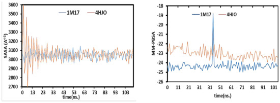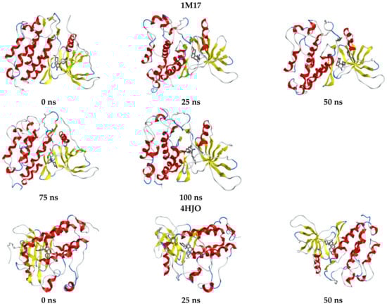 The “solvent-accessible-surface-area, SASA” simulation was studied for the investigated complexes to study the variation in the topology of the complexes, where the higher SASA learns the extent of the surface volumes. Lower SASA is defined by the elongated nature (Figure 9). The steady-state for 1M17 and 4HJO after 13 ns and the low variation degree for the SASA profiles along the simulation trajectories demonstrated their stable nature. Furthermore, all complexes had nearly the same SASA degree and described the condensed form of these protein complexes during the interaction of compound 4. Furthermore, the slight deviation for MM-PBSA for the overall time-scale, showed the strong interaction between the ligand and amino acid backbone for proteins, which showed a firm H-bonding pattern. The system behavior can be explained by the regularly changed binding pose of the compound at the binding pocket of the enzyme, where the binding affinity was stronger and still produced good intermolecular interactions. The different snapshot of compound 4 with the enzyme is given in Figure 9.