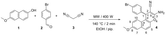 2.2. Synthesis of 3-Amino-1-(4-Bromophenyl)-8-Methoxy-1H-Benzo[f]chromene-2-Carbonitrile (4)