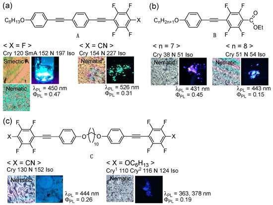 Chemical structure, phase transition behavior, and crystalline-state photoluminescence (PL) behavior of (a) fluorinated bistolane-based PL liquid crystals (PLLCs) (A), (b) fluorinated tolane-based PLLCs (B), and (c) fluorinated tolane dimer-type PLLCs (C).